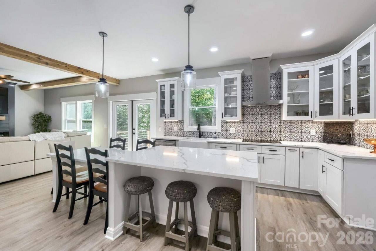 Welcome to this stunning farmhouse-style retreat nestled on just under an acre of nature lover's paradise ? complete with a wooded backyard, babbling creek, and the kind of privacy that's nearly impossible to find. From the moment you arrive, the charcoal board-and-batten exterior, covered front porch, and landscape lighting set the tone for what awaits inside.Step through the foyer, and you're immediately greeted by a thoughtfully designed first floor featuring laminate wood flooring throughout. A private office off the foyer with double French doors is tucked away from the main living areas, making it ideal for remote work or a quiet retreat. The open-concept great room impresses with soaring natural wood ceiling beams, an electric fireplace framed in shiplap, recessed lighting, and a wall of windows overlooking the lush wooded backyard ? all flowing seamlessly into the kitchen.The kitchen is an absolute showstopper and the heart of this home. White shaker cabinets with glass-front uppers are paired with a dramatic artisan tile backsplash, quartz countertops, and a large custom island with seating. A ceramic farmhouse sink is centered under a window with backyard views, and the stainless steel appliance package includes double wall ovens, an electric cooktop, a dishwasher, and a microwave. Pendant and recessed lighting, black hardware, and an oversized pantry with a built-in butler's pantry ? perfectly styled as a coffee bar ? complete this chef's dream space.The informal dining area features a built-in table with a quartz countertop connected to the island, plus French doors that open to the impressive 20x20 deck with cable railing, overlooking a stunning canopy of mature trees and the creek below. Whether you're sipping morning coffee or entertaining at sunset, this outdoor space is pure magic.Also on the main level is a stylish powder room with a quartz vanity and black fixtures. The finished attached two-car garage features epoxy flooring, a MyQ smart opener, recessed lighting, and extra storage.Upstairs, the spacious landing leads to four well-sized bedrooms, all with laminate wood flooring and ceiling fans. The primary suite offers a large walk-in custom closet and a spa-quality ensuite with a double quartz vanity, black fixtures, and an oversized walk-in tile shower with wave-texture wall tile, dual niches, mosaic floor tile, and a window that brings the outdoors in. Three additional bedrooms are generously sized ? each with laminate wood flooring and ceiling fans ? with one bedroom offering peaceful wooded views through dual windows. All three are served by a well-appointed hall bath with quartz vanity, black fixtures, and a tub/shower combo. A laundry room that redefines the standard ? white cabinetry, quartz countertop, artisan tile backsplash, floating wood shelf, and a window.Exterior extras include black gutters, landscape lighting, an extra parking pad, and a creek-side backyard that truly cannot be replicated. And t